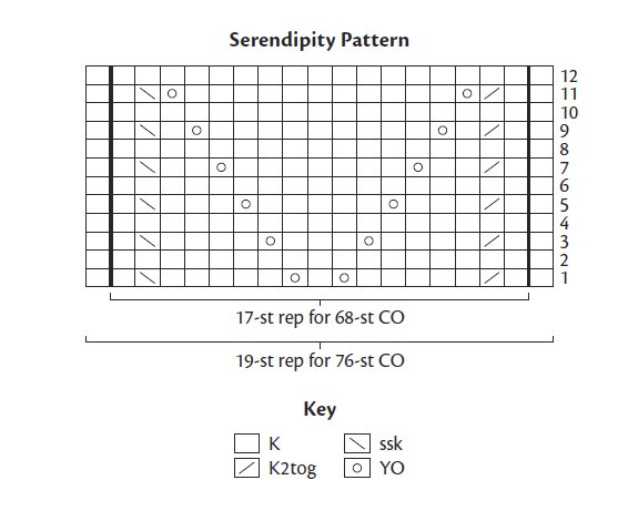 Knit 1 rnd. Beg Serendipity patt and work 5 complete vertical reps, then work rnds 1–11 once more (approx 6 5⁄8").