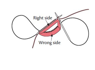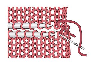 Use this technique to sew the ends of the toes together. Work with the two pieces on the needles with wrong sides together, one needle behind the other. Thread a tapestry needle with the yarn attached to the back needle and work as follows: