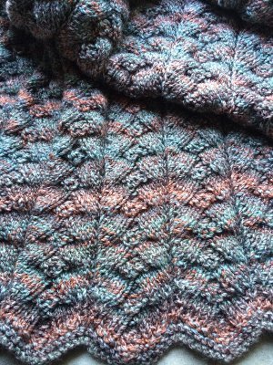 This is a pretty color throw, but you would have to use the same kind of yarn to get the same look. I also think with the self patterning yarn you lose some of the effect of the pretty pattern. I would be tempted to make it in a rich solid color so that you could see the pattern better.