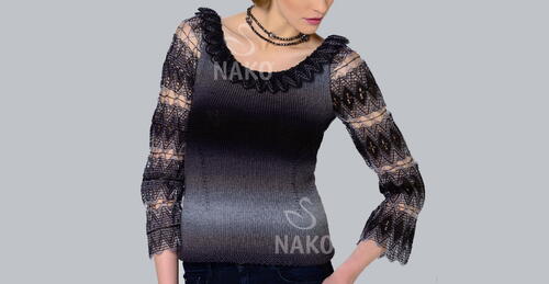 "We have prepared a great blouse pattern for women. This pattern can be both daily wear and complementary to an evening wear. This pattern, in which knitting and crochet techniques are used together, has easy instructions. This beautiful work among free knitting patterns for women will be a great experience for beginner knitting and crochet connoisseurs. Cast on 86 stitches with yarn color no.85804. Knit garter stitch for 2 cm and then change to stockinette stitch. When the body measures 10 cm, knit 22 stitches at both sides; pick up adjacent 2 stitches together and cast off 1; work 1x1 cable with the adjacent 1 stitch and 1 stitch that has been cast off; knit the stitches in the middle."