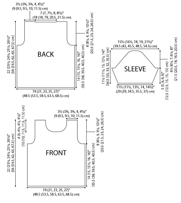 - Finished Bust: 38 (42, 46, 50, 54)” (96.5 (106.5, 117, 127, 137) cm)