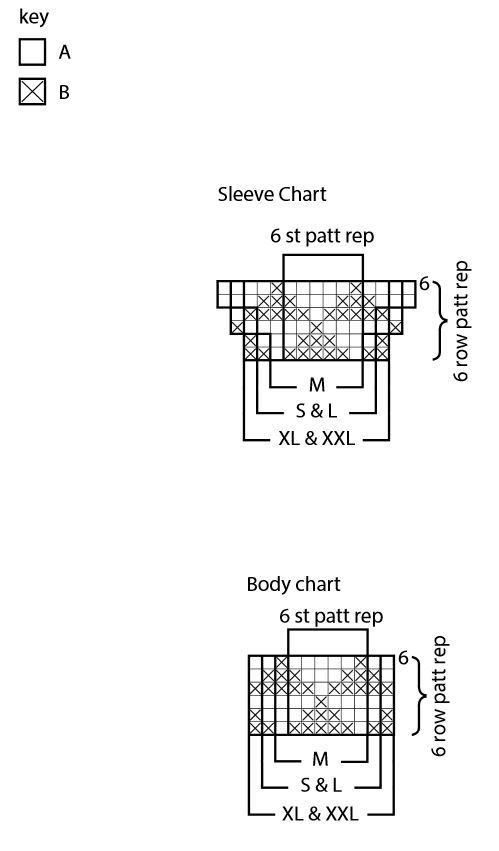 Beg and ending rows as indicated, using the fair isle of the charts below, repeating the 6 st patt rep 18 [19: 19: 20: 21] times across each row and repeating the 6 row patt repeat throughout, cont in patt from chart for sleeve, which is worked entirely in st st beg with a K row, as folls: