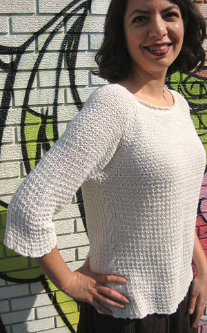 I substituted 100% cotton Sugar & Cream yarn for the outrageously expensive hemp yarn. It is the same weight/stitches per inch, drapes well, and a huge cone is about $8 at Walmart. I lengthened the sleeves and eliminated the bell effect, preferring a 3/4 length with a bit of ribbing rather than the flutter effect. Also, I didn't care for the boxy neck opening, and closed it in a bit with a rolled collar. Instead of just a few added rows, I reverse stockingette knit about 15 rows, which curls nicely and keeps my bra straps from showing.