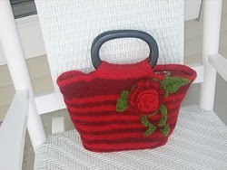 Knit and felt a tote bag in complimentary colors of feltable yarn. This tote bag knitting pattern is complete with a knit rose embellishment.