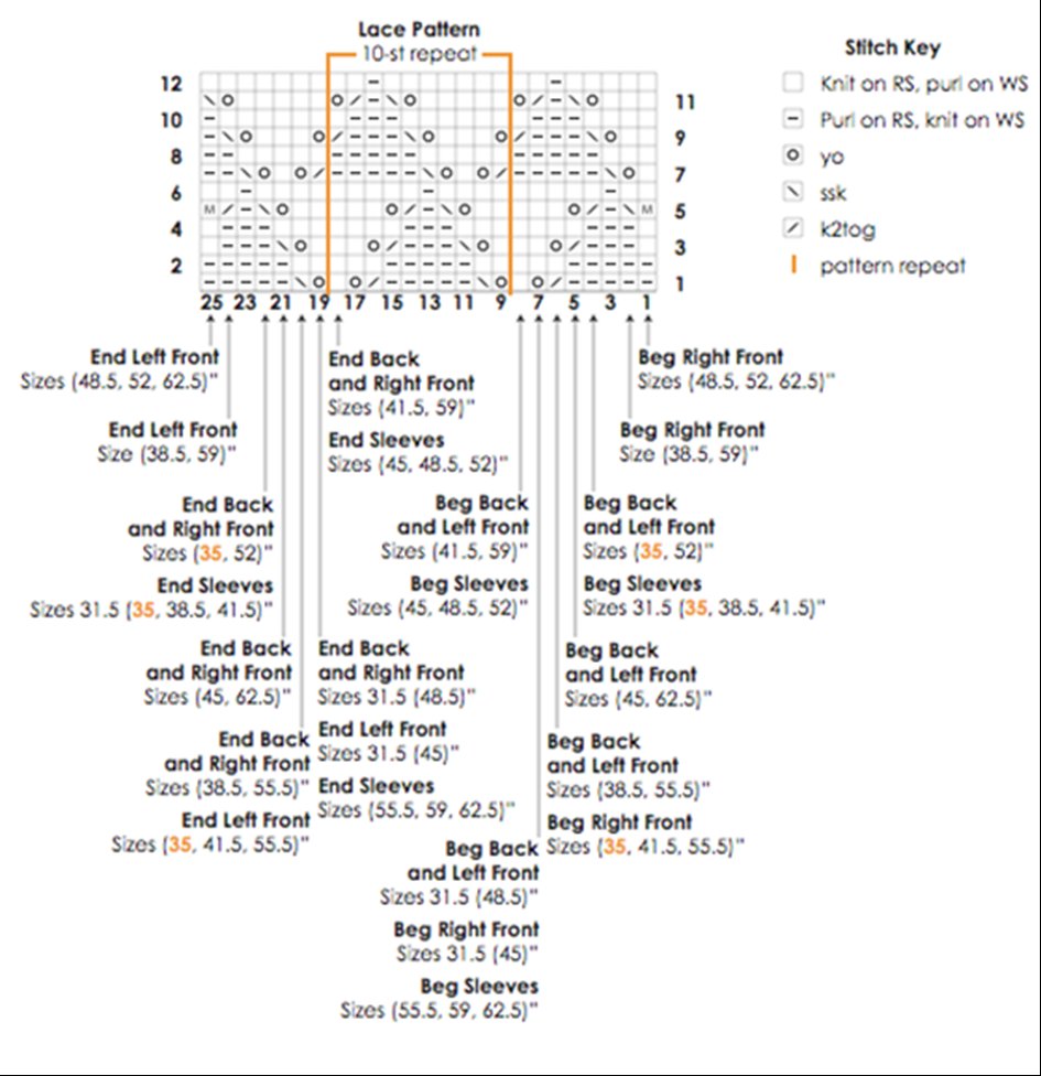 NotesWhen working chart, be sure to work corresponding inc's and dec's together. At selvedge edges, if a yo is the first st of the chart, work m1 instead of yo.