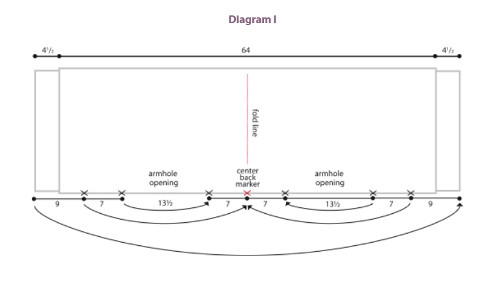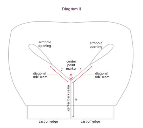 Diagonal side seams: Place center point marker at top of center back seam. Sew seam to 2nd set of markers on each side (see Diagram ll below) leaving openings for armholes.