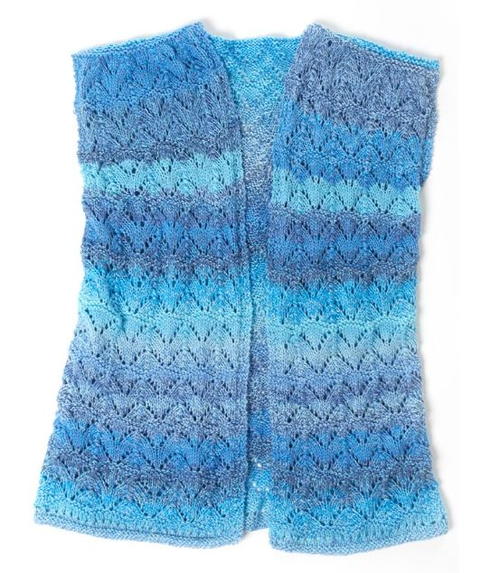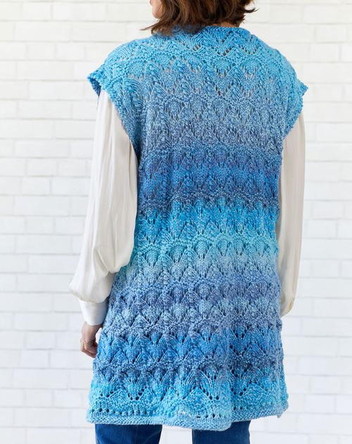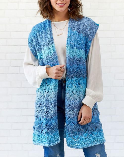 The Shipwreck Beach Vest boasts a lovely, yet simple, lace design and a gradient of beautiful blues. What's not to love? Unlike traditional vest patterns, this garment lacks any sort of closure in the front, so it can relax comfortably open or be worn cinched closed with a belt. Vest knitting patterns also typically end closer to the hip area, but this one is elongated to a tunic-length, making it appropriate for both dressy and casual occasions. While the construction of the vest is more suited for intermediate knitters, the lace pattern is easy enough for beginners to master.