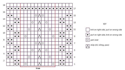 sk2p – slip 1 knitwise, k2tog, pass slipped stitch over – 2 sts decreased