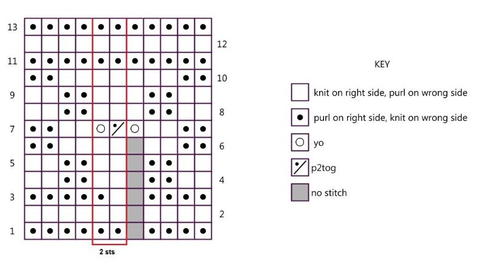 Row 7: P2, k3, *k3, yo, sk2p, yo, k4; repeat from * to last 4 sts, k2, p2.