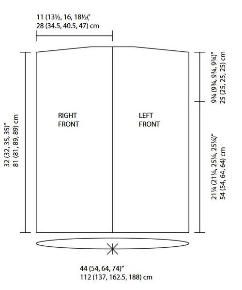 Finished Bust/Chest Measurement: 44 (54, 64, 74)" [112 (137, 162.5, 188) cm] slightly blockedLength: 31 (31, 35, 35)" [79 (79, 89, 89) cm]