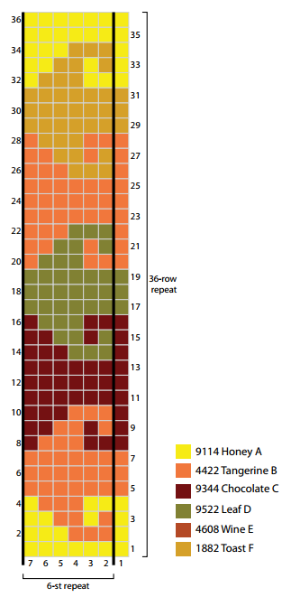 - RED HEART® Soft®: 1 ball each of 9114 Honey A, 4422 Tangerine B, 9344 Chocolate C, 9522 Leaf D, 4608 Wine E, and 1882 Toast F