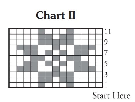 Next rnd: (With MC, K1. With A, K1) 4 (5-5) times. With A, K3. With MC, K1. Work 2nd row of Chart II (IVIV) across next 13 (17-17) sts. With MC, K1. With A, K4. (With MC, K1. With A, K1) 4 (5-5) times.