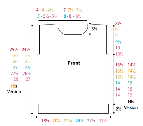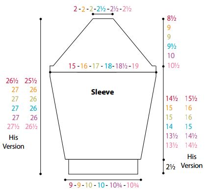 Change to larger needles and proceed in stocking st until work from beg measures 16 (16-16- 16½-16½-16½)" [40.5 (40.5- 40.5-42-42-42) cm] for Her Version or 17 (17-17-17½-17½-17½)" [43 (43-43-44.5-44.5-44.5) cm] for His Version, ending on a purl row. Shape raglans: Cast off 2 (2-3-3- 4-4) sts at beg of next 2 rows. 81 (89-95-105-117-135) sts.**