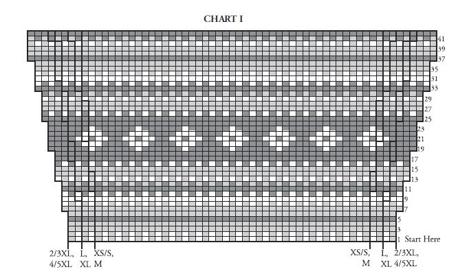 Knit in Chart II to end of chart, reading rnds from right to left and noting 15-st rep will be worked 16 (17-18-20-22-26) times. 64 (68-72-80-88-104) sts.