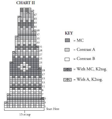 Note: When working from chart, carry yarn not in use loosely across WS, but never over more than 5 sts. When it must pass over more than 5 sts, weave it over and under color in use on next st or at center point of sts it passes over. The colors are never twisted around one another.
