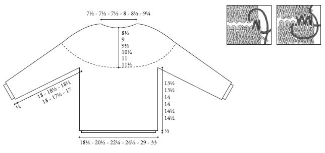Change to larger needle and knit in rnds until work from beg measures 14 (14-14½-14½-15-15) ins [35.5 (35.5-37-37-38-38) cm].