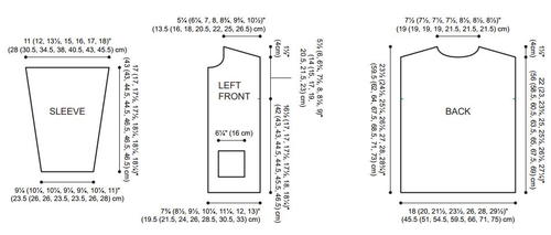 Finished SizeCardi measures 36 (40, 43, 47, 52, 56, 59)" (91.5 (101.5, 109, 119.5, 132, 142, 150) cm) around bust and 23½ (24½, 25¼, 26½, 27, 28, 28¾)" (59.5 (62, 64, 67.5, 68.5, 71, 73) cm) in length not including hood.