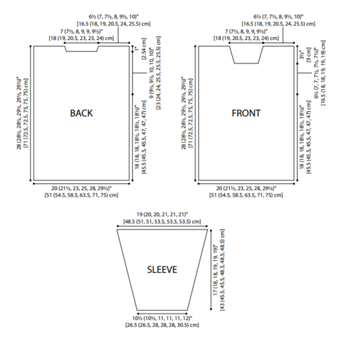 Finished Bust: 40 (43, 46, 50, 56, 59)” [101.5 (109, 117, 127, 142, 150) cm]