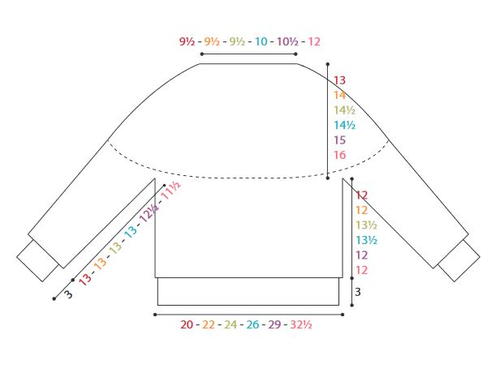 Body and Sleeves are worked in the round from lower edge up separately then joined into Yoke. See diagram below.