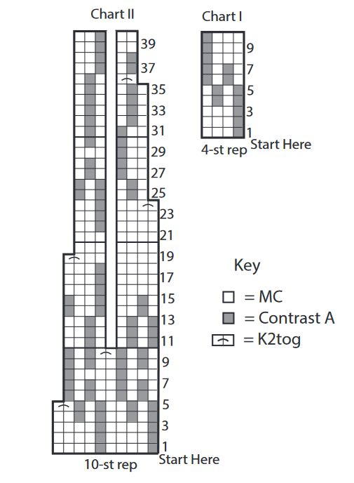 Change to larger circular needle and work Chart I to end of chart, reading rnds from right to left and noting 4-st rep will be worked 29 (31-34-37-41-46) times. Break A. Charts are shown below.