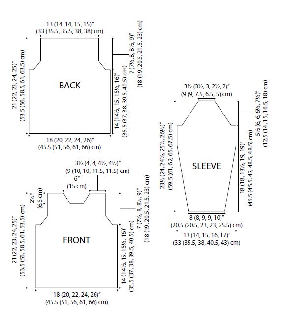 - Finished Bust/Hip: 36 (40, 44, 48, 52)” [91.5 (101.5, 112, 122, 132) cm]