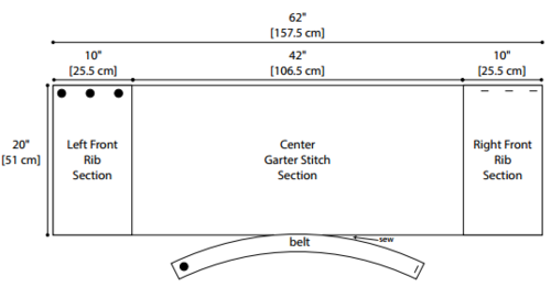 2. The rectangle is worked back and forth in rows in three sections: Left front rib section, Center Garter stitch section, and right front rib section.