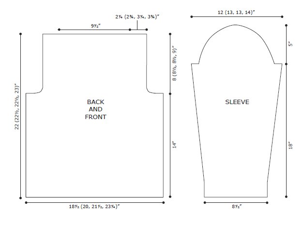 Block pieces to measurements. Sew Shoulders, leaving 9½” open for neck. Set in SLEEVES; sew side and sleeve seams.