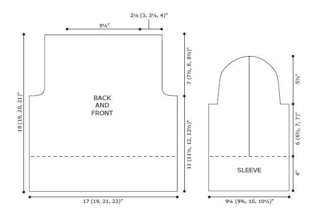 Block pieces to measurements. Sew Shoulder seams along bind-off edge for 2½ (3, 3½, 4)” from Armhole edge on each side. Place a marker ½” down from Shoulder seam, on both BACK and FRONT. Sew Sleeve and side seams. Set in SLEEVE, leaving ½” open at top of Armhole on each side of Shoulder seam (place edges of Sleeve Opening at markers on BACK and FRONT).