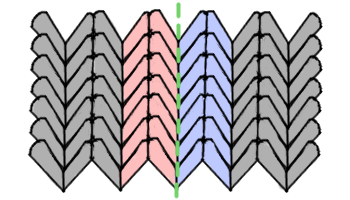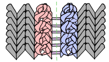 Often, the pattern will tell you where you will be steeking. For the purpose of practice, you can pick literally any stitch column in your tube. Eventually, you will be steeking directly down the center of the stitch column you chose. This is identified in the image below with the dotted green line. The two legs of stitches on either end of this line are the stitches you will be securing. These each compromise half of the stitch that you are cutting down the center, and half of the stitch either to the left or right of it. -