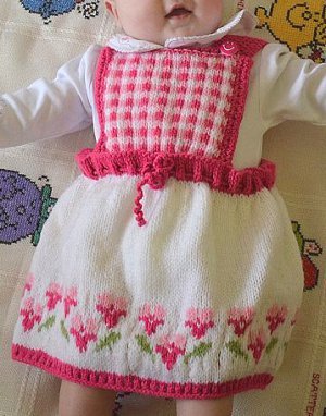 The Bed of Roses Baby Dress is the quintessential knit baby dress pattern for all your spring and summer festivities. This simply stunning baby dress features an apron-style construction complete with a checkerboard bib, ruffled waistband, and row of roses lining the skirt. The Bed of Roses Baby Dress is sure to become a family heirloom you'll treasure for years to come.
