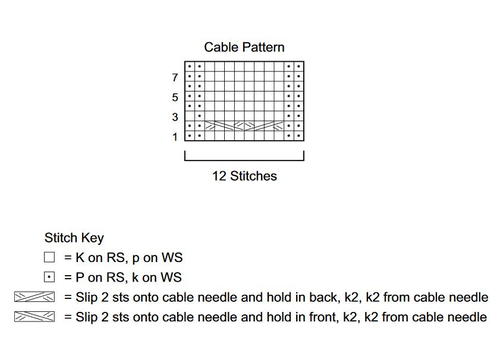 Row 1 (Wrong Side): K4, place marker, beginning with Row 1, work Cable pat over next 12 sts, place marker, k19 (20, 21), place marker, work Cable pat over next 12 sts, place marker, k19 (20, 21), place marker, work Cable pat over next 12 sts, place marker, k4.