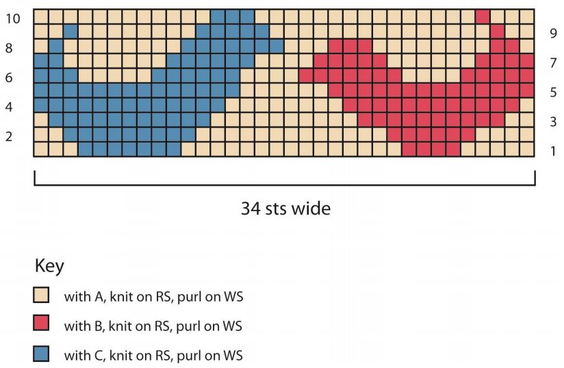 Work through Row 10 of chart, changing colors as indicated, and keeping sts on outside of marker in St st using A. After chart is complete, continuing in A only, work 12 more rows of St st.