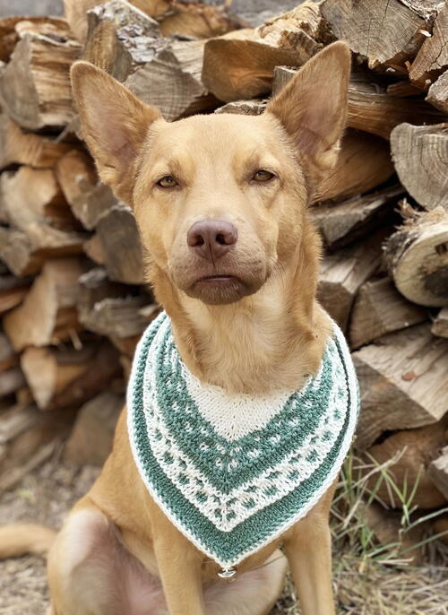 "The Snarf Scarf is triangular in shape and uses very little yarn; therefore it would be a great stash diving project. It uses DK weight yarn with only one color at a time, works up in just a couple hours and is completely customizable to the size of your critter. My dogs are both medium size dogs and the scarf fits them as the pattern is written.If you have a very large dog, there is a section where you would repeat until it’s the right size and there’s a place marked where to stop if you have a smaller critter."