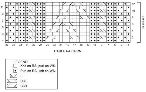 Row 12: [K1, p1] twice, p3, LT, p3, k2, C3F, C3B, k5, p3, LT, p3, [p1, k1] twice.