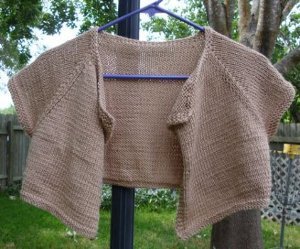 This nice little shrug is perfect to wear in an over air conditioned office this summer. It provides just enough warmth around your shoulders to make you comfortable while sitting at your desk. Though it does not have a button, you could easily add a loop and button closure after finishing the cardigan or do as the author suggests and close it with a nice costume jewelry brooch.