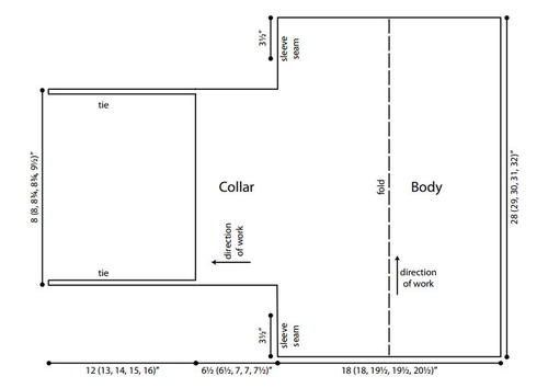 Finished SizeTo Fit Bust 32–34 (36–38, 40–42, 44–46, 48–50)”: Finished Length (cuff-to-cuff): 28 (29, 30, 31, 32)” Finished Front Opening Circumference: 42 (44, 46, 48, 50)”