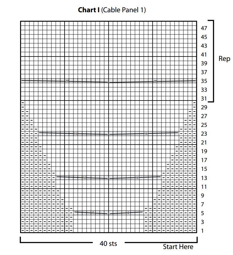 Cont even in pat, rep 31st to 48th rows of Cable Panel 1 until work from beg measures approx 39½ (46-53)" [100.5 (117-134.5) cm], ending on a 48th row.