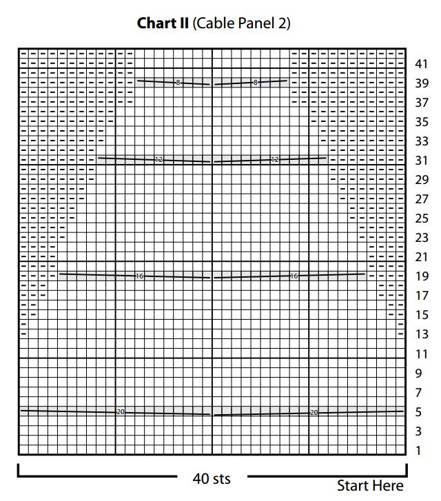 2nd row: Knit to marker. Slip marker. Work 2nd row of Cable Panel 1. Slip marker. Knit to end of row.