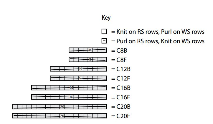 C8(12-16-20)F = Slip next 4(6-8-10) stitches onto cable needle and leave at front of work. K4(6-8- 10), then K4(6-8-10) from cable needle.