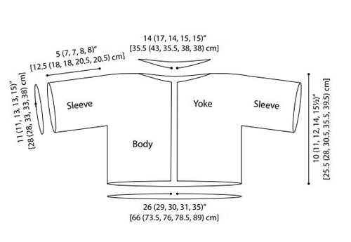 Finished SizeTo Fit Chest: 21 (23, 25, 26½, 28)" [53.5 (58.5, 63.5, 67.5, 71) cm] Finished Chest: 26 (29, 30, 31, 35)" [66 (73.5, 76, 78.5, 89) cm], closed Finished Length: 10 (11, 12, 14, 15½)" [25.5 (28, 30.5, 35.5, 39.5) cm]