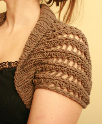 This Ribbed Lace Bolero is a dainty shrug, even though it's made with worsted weight yarn. It's a simple knitting pattern with no complicated shaping making it easy to customize fit. It looks great over a tank top or sundress.