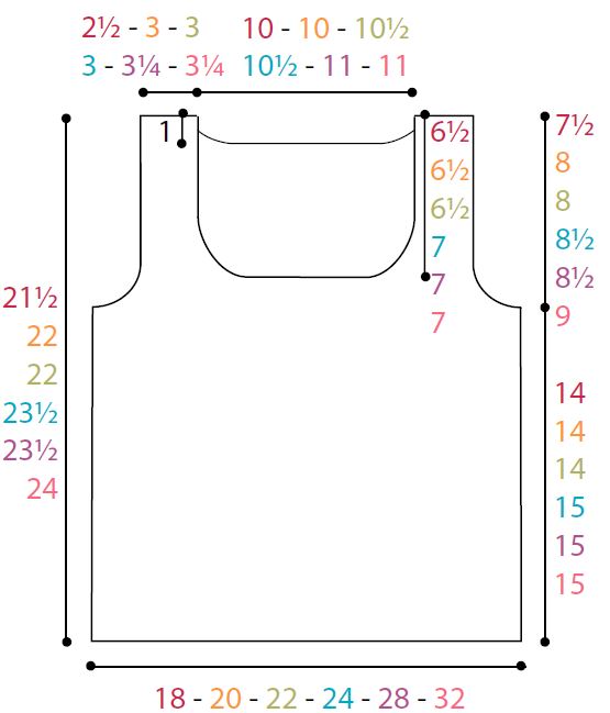 The instructions are written for smallest size. If changes are necessary for larger sizes the instructions will be written thus ( ). Numbers for each size are shown in the same color throughout the pattern. When only one number is given in black, it applies to all sizes.