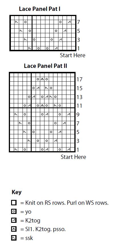 1st row: (RS). K9 (2-6-4-2-6). Work 1st row of Lace Panel Pat I 6 (8-8-9-11-12) times. K9 (2-6-4-2-6).