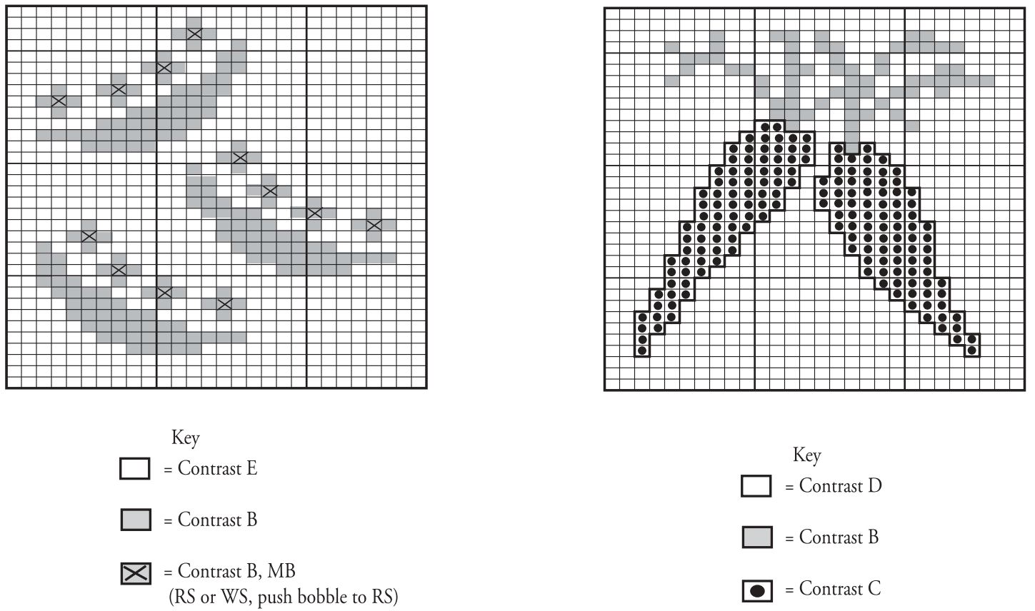 Note: When working from charts, wind small balls of the colors to be used, one for each separate area of color in the design. Start new colors at appropriate points. To change colors, twist the two colors around each other where they meet, on WS, to avoid a hole.