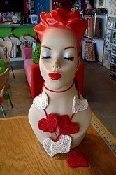 Adorn your neck with hearts for Valentine's Day. Wear this knitted pattern necklace over a pink, red, or white top. Show everyone that you think love rocks!