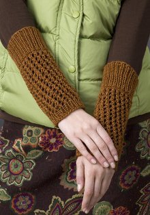The staggered mesh pattern is worked back and forth on straight needles, then wristlets are seamed.