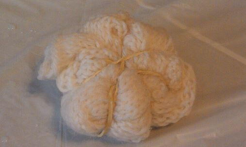 Gently unwrap your project, removing any rubber bands. This is always my favorite part of tie dyeing because you never really know how it is going to turn out until you open it up. Rinse out the excess dye using the warmest water recommended for your fiber type (for wool I used cool water.) The manufacturer instructions recommend that you machine wash your dyed project on the recommended cycle, but I would not put 100% wool in a washing machine unless I wanted to felt it. I therefore would add a little laundry detergent to the hand wash the knit project until the water runs clear.