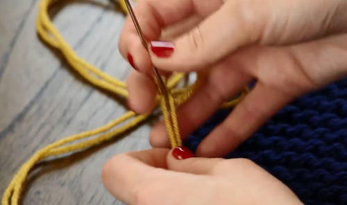 Thread the yarn through a tapestry needle. Bring the tapestry needle to the center of the piece of yarn and tie the other two ends together so you have a circle of yarn.